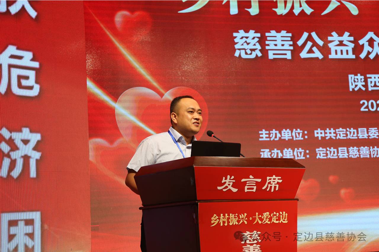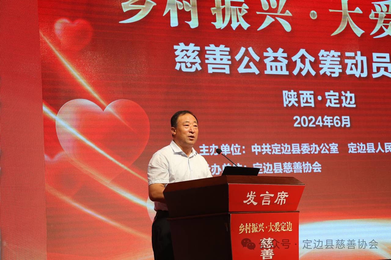 定边县慈善协会会长马保珍致辞并解读中共定边县委办公室、定边县人民政府办公室关于印发《“乡村振兴·大爱定边”慈善公益众筹活动实施方案》的通知。他讲到:定边县委、政府坚持一切为了人民,自觉问计于民、问需于民,始终同人民同呼吸、共命运、心连心,不断增进民生福祉,着力解决人民群众急难愁盼问题,把惠民生、暖民心、顺民意的工作做到群众心坎上,增强人民群众获得感、幸福感、安全感。定边县慈善协会自觉树立“党委政府抓什么,社会组织就服务什么;人民群众缺什么,社会组织就补位什么”的理念,以“扶危济困、善行定边”为宗旨,以帮助他人、快乐自己为精神动力,以“慈善项目、幸福家园”为载体,以“乡村振兴、为民造福”为目的,主动配合各级党委政府,广泛链接各类资源,充分发挥第三次分配作用,几年来,募集善款善物2.86亿元,全面开展助学助教、助孤助残、助医助困、抗疫救灾、乡村振兴等十大类型60余个子项目,惠及弱势群体达20万人次。他强调:单靠慈善协会几人,单枪匹马,能力是有限的。汇聚社会磅礴伟力,使人人向善、事事行善、处处有善,慈善文化进农村、进企业、进机关、进学校、进社区,才是我们追求的目标,以点滴之爱汇聚成善的暖流,形成强大合力,在践行第三次分配和助力乡村振兴的社会大实践中绽放绚丽之花,为共建富裕、绿色、文明、幸福、魅力定边贡献力量!针对此次活动,除了省慈善协会拿出1800万元对全省项目进行激励资助外,定边县慈善协会也拿出200万元,对我县参与的3个项目给予30%-50%的激励资助,且谁募捐、谁受益。他希望:慈善是诚心之为、爱心之行、善心之举,慈善是做好事、做实事、解难事,慈善是一种品德、一种追求、一种境界、一种奉献、一种文化、一种精神、一种信仰,慈善是中华民族传统美德、是精神世界的太阳、是蓝天下最大的慈爱,慈善弘扬正向精神,你们都是善田的耕耘者、大爱的实践者、正量能的传播者,愿人人都献出一点爱,世间将变得更美好!