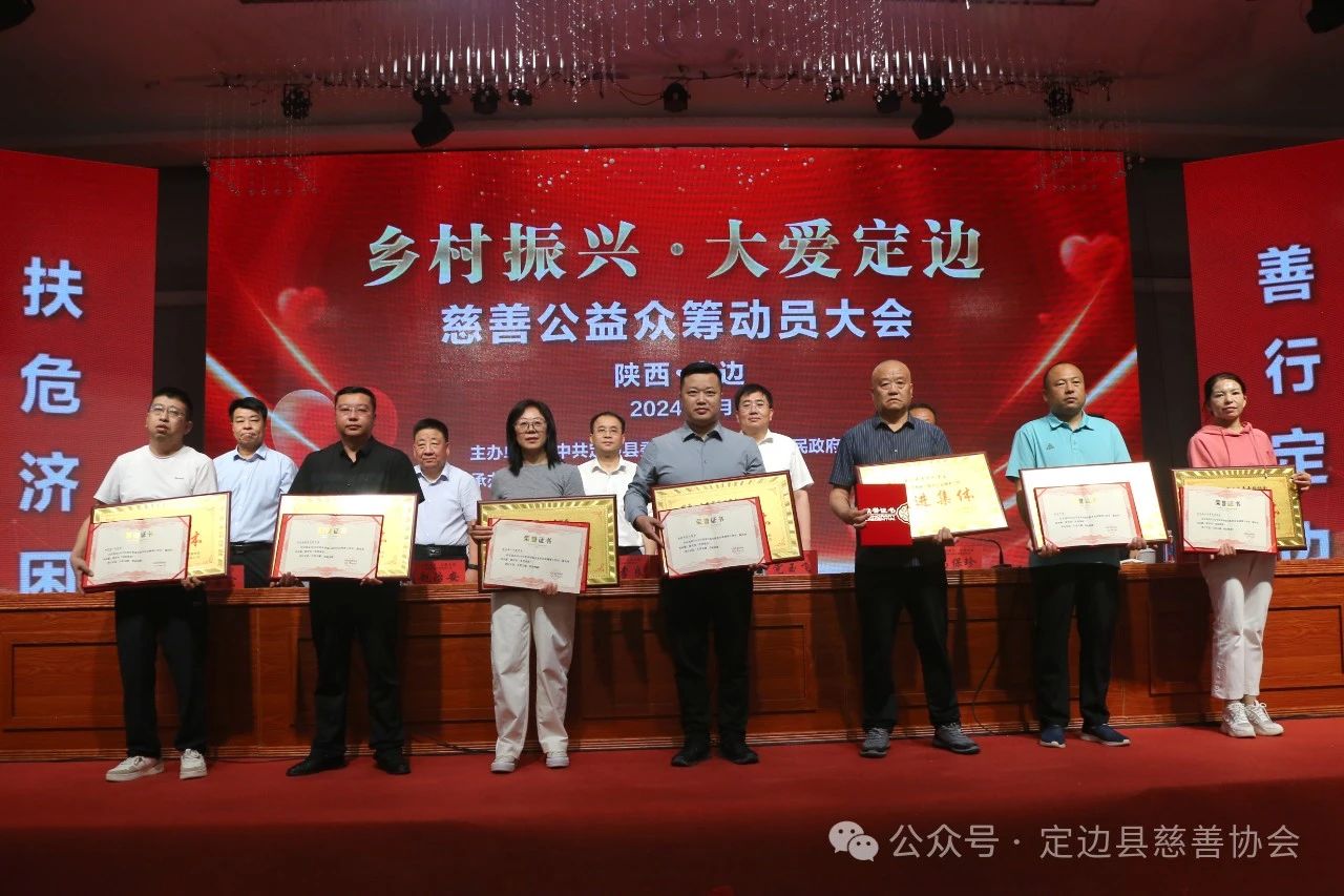 现场为长庆油田分公司第六采油厂、定边县众源天然气有限责任公司、定边县智诚运势实业集团有限公司、杨井镇人民政府、白泥井镇人民政府、姬塬镇人民政府、樊学镇人民政府、定边县教育和体育局、定边县工业商贸局、西安市定边商会、安边镇雷圈村委会、定边中学、定边县水兵舞舞蹈协会等13家爱心单位颁发荣誉牌匾和证书。